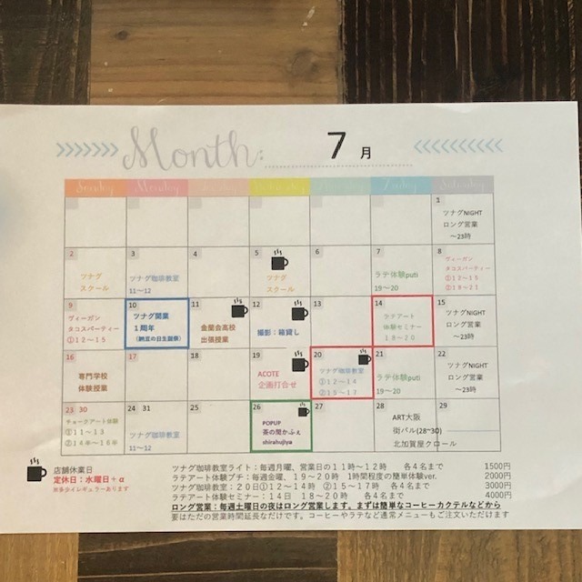 7月のツナグCOFFEE&CREATEの営業カレンダーです。