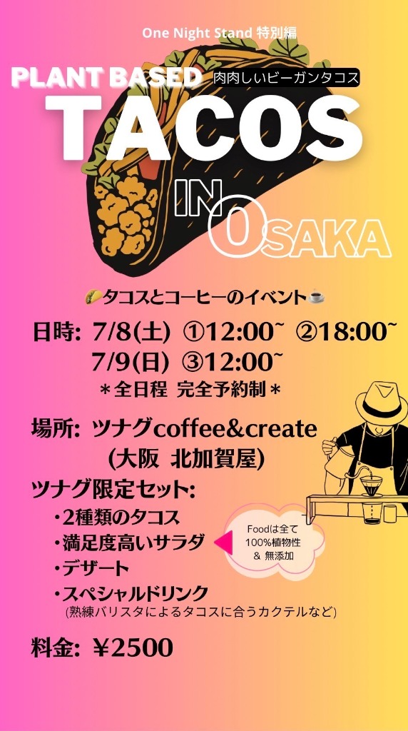 7/8.9のヴィーガンタコスパーティもまだ若干空きがありますのでご予約もお待ちしております。